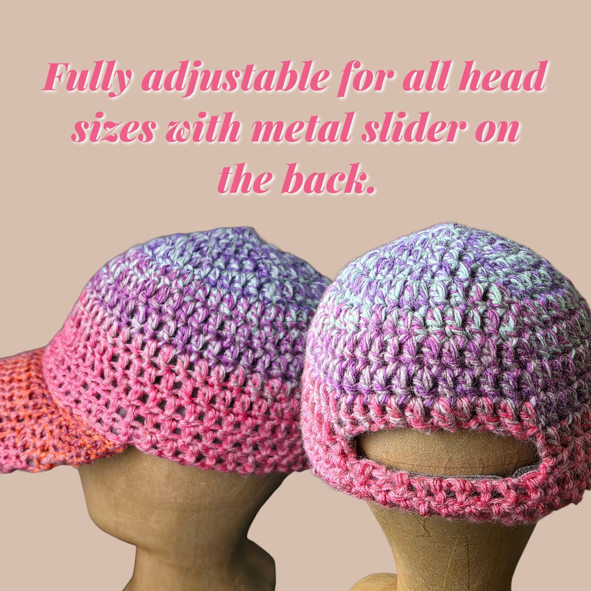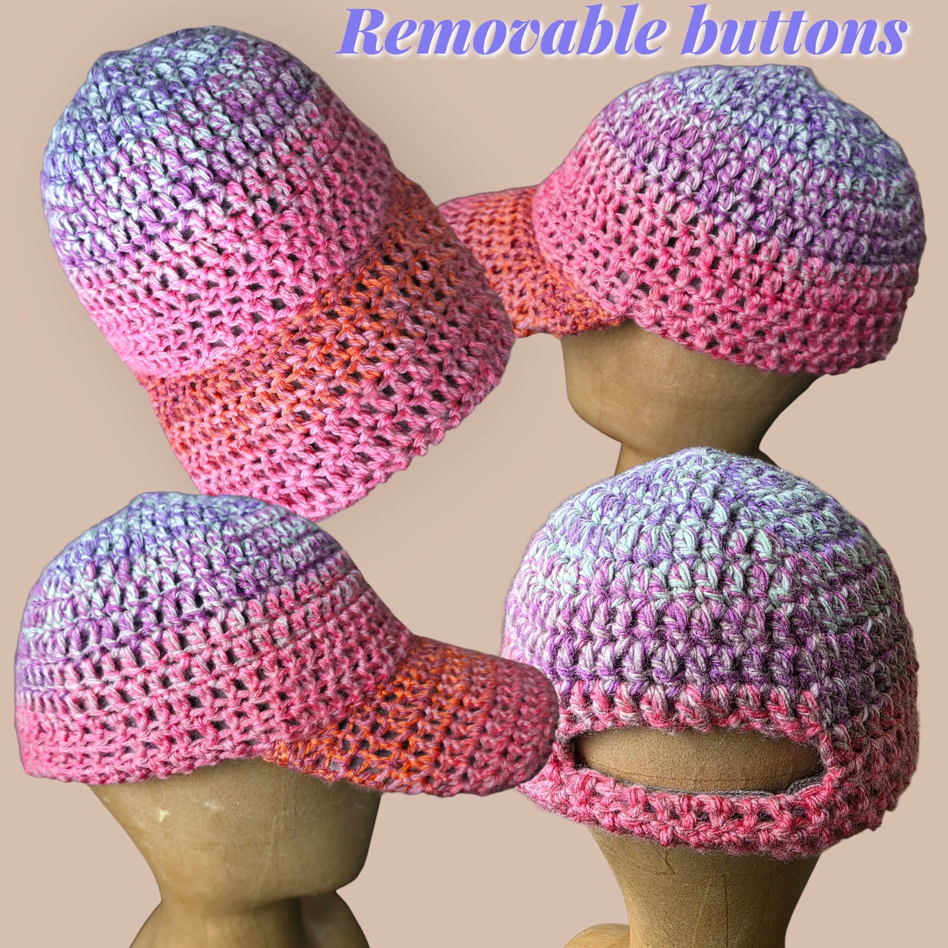 Times are crazy right now, but that doesnt mean we cant stay positive and kniw that everything is gonna be alright! Hand crochet cap with 3 buttons that are removable. Also has a sliding strap on the back to adjust for sizing. Please note that no cap will look the same. The yarn used is variegated, which means there are multiple colors and unpredictable colorways with the yarn. This yarn has pnk, purple, light blue, orange and dark green colors.