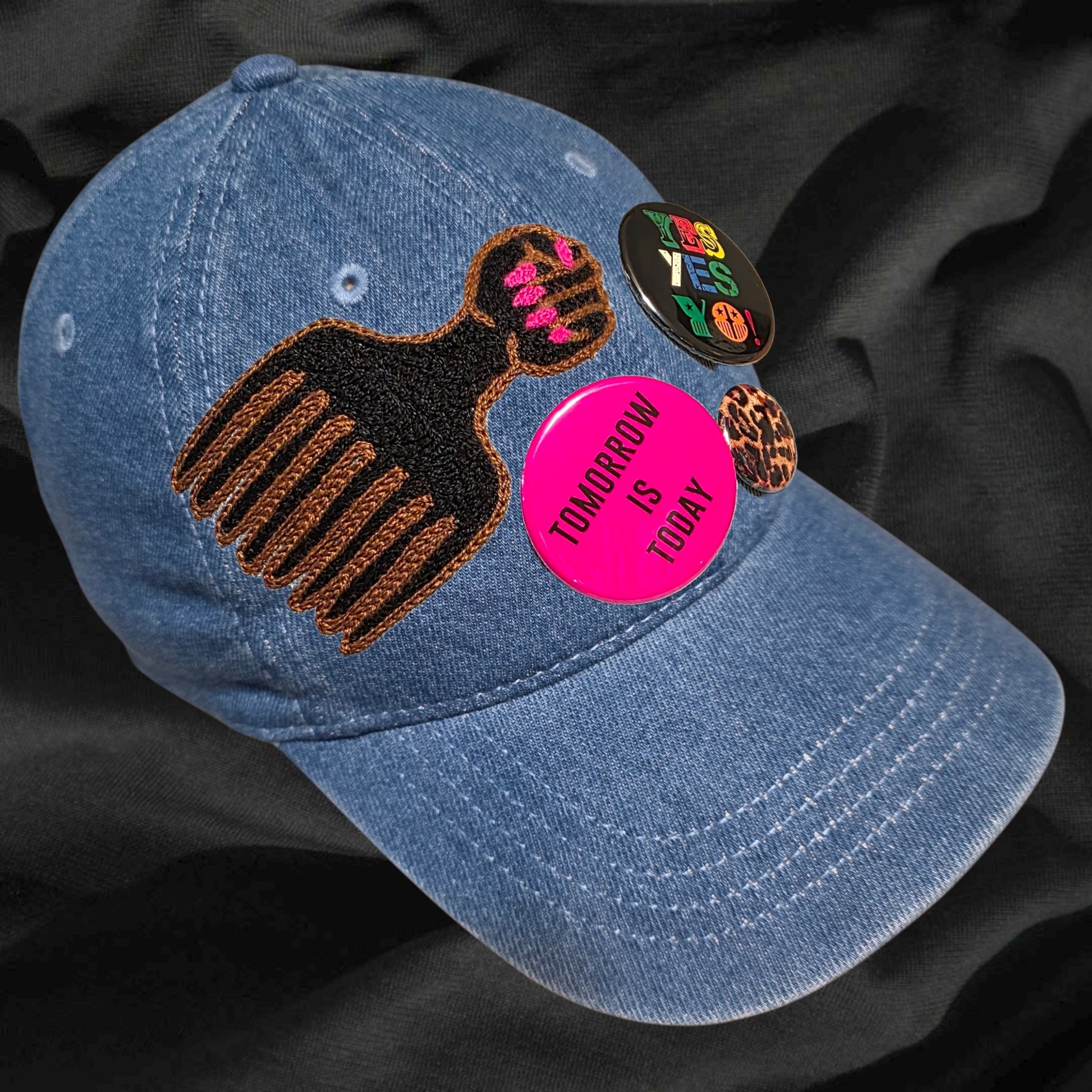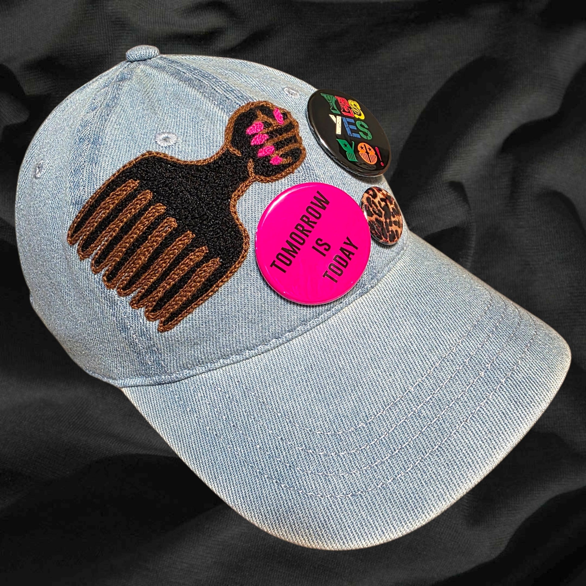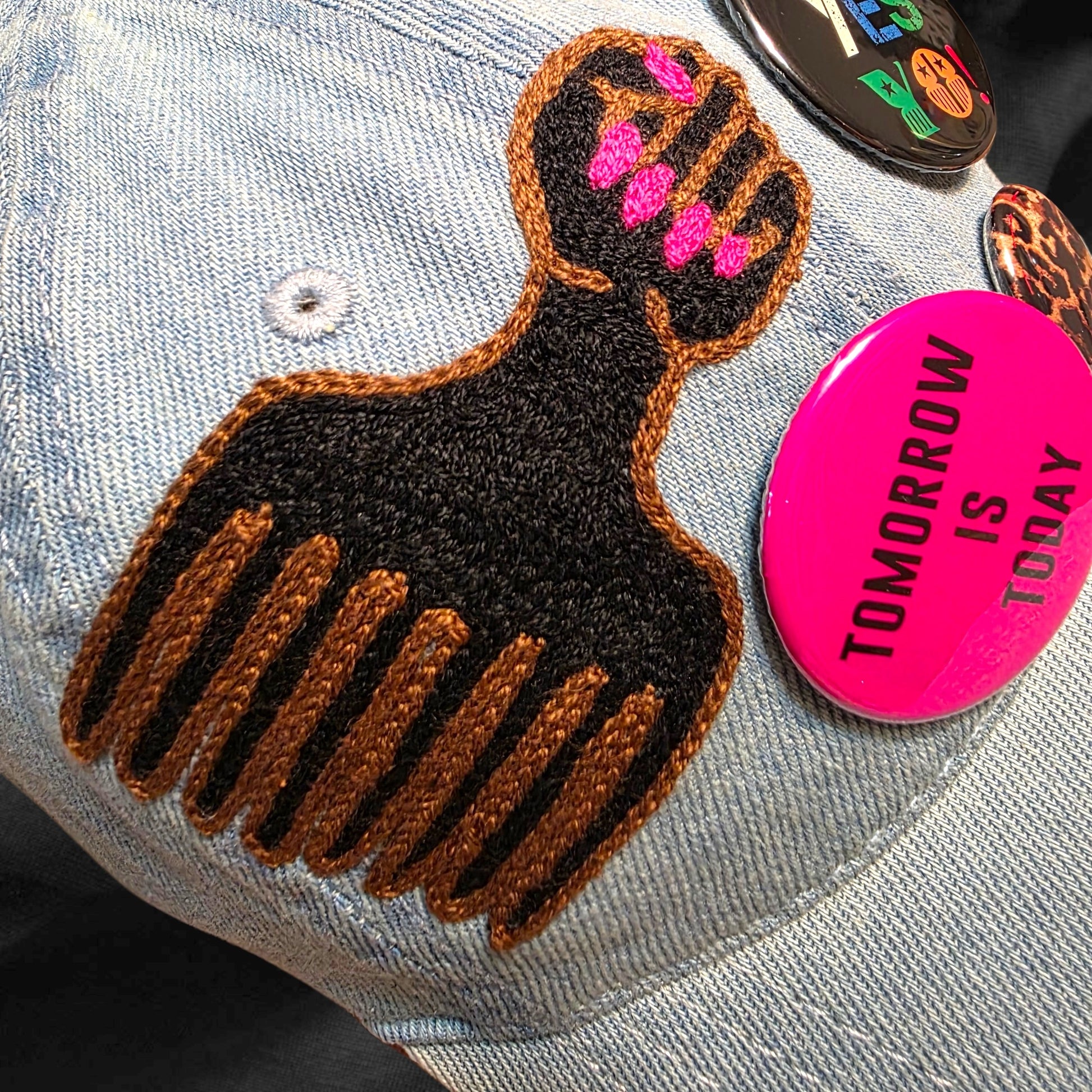 Get into this new cap I made just in time for Black History Month and Women's History Month. This cap features a chainstitch embroidered black power fist hair pick with cute pink nails! It also comes with buttons I thrifted from Fabscrap. A company that helps recycle materials from NYC design houses.