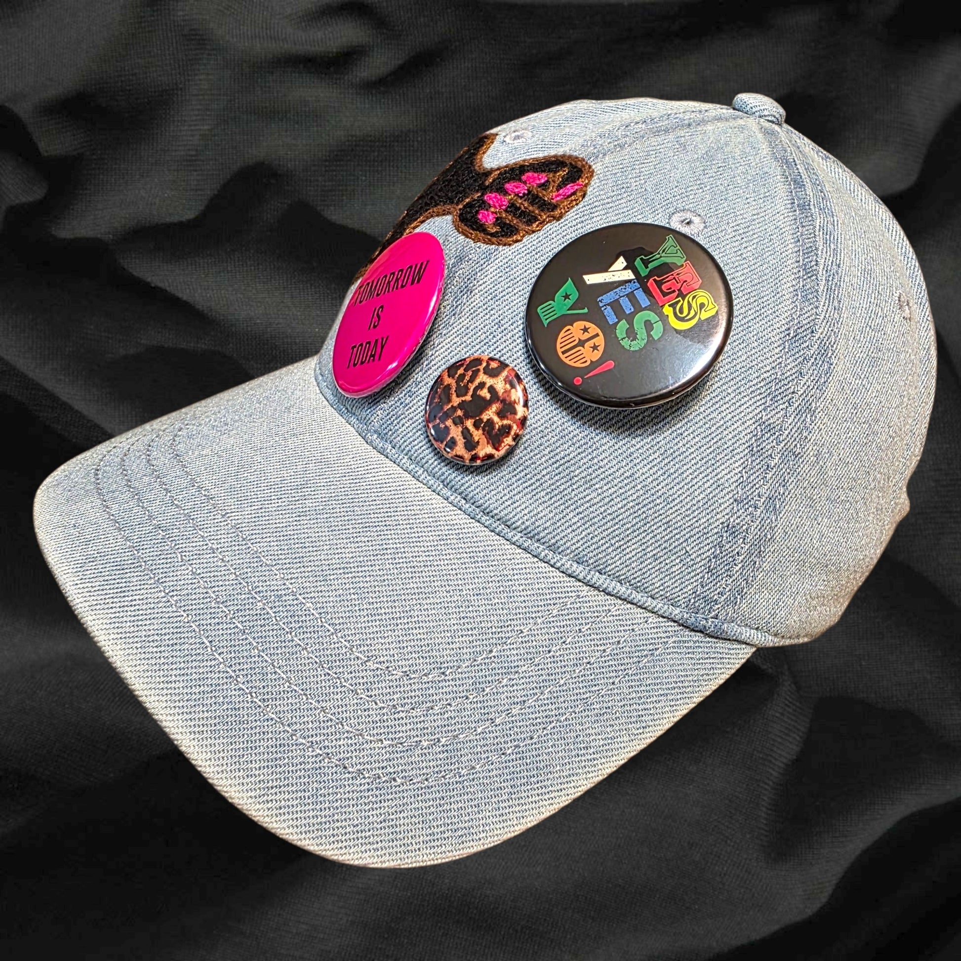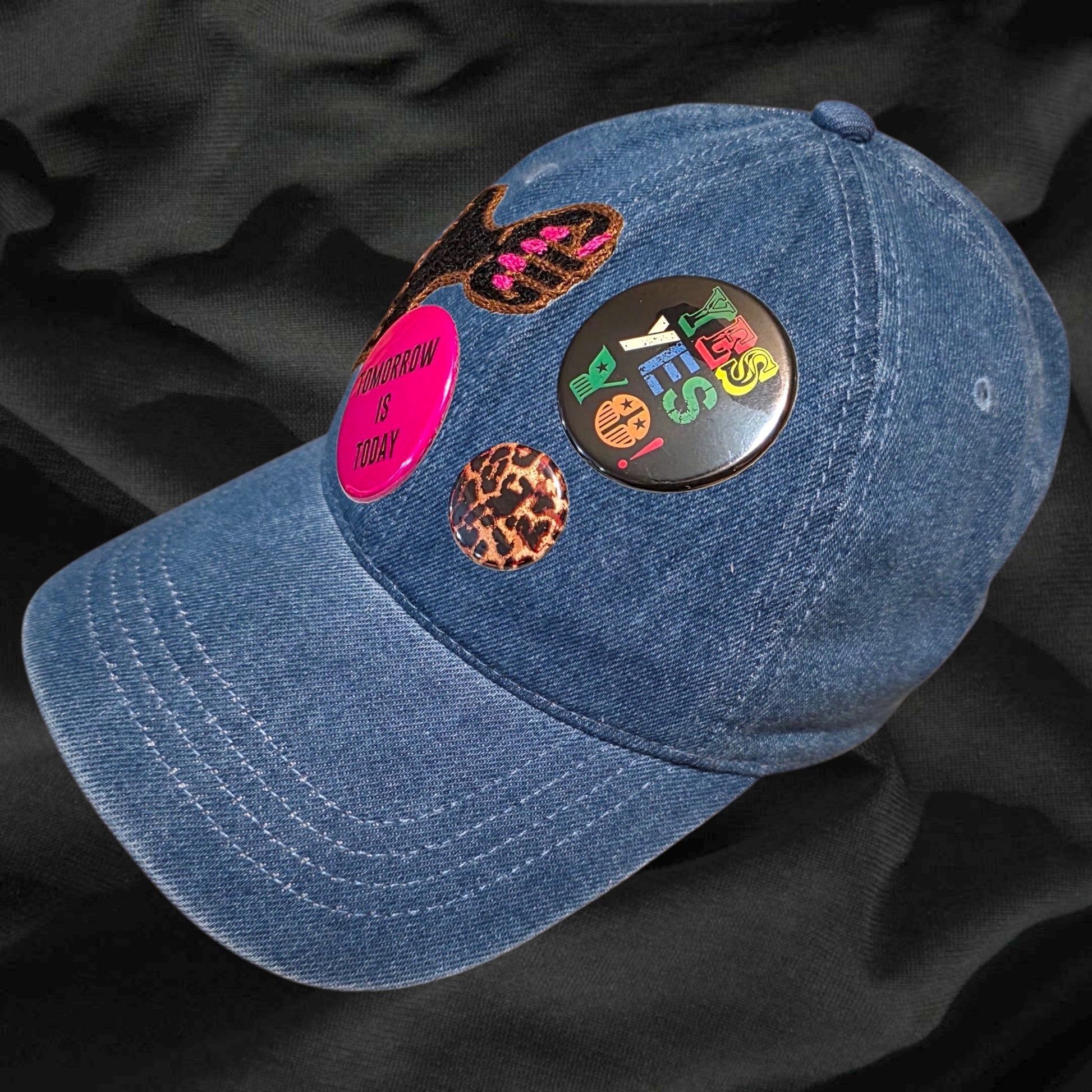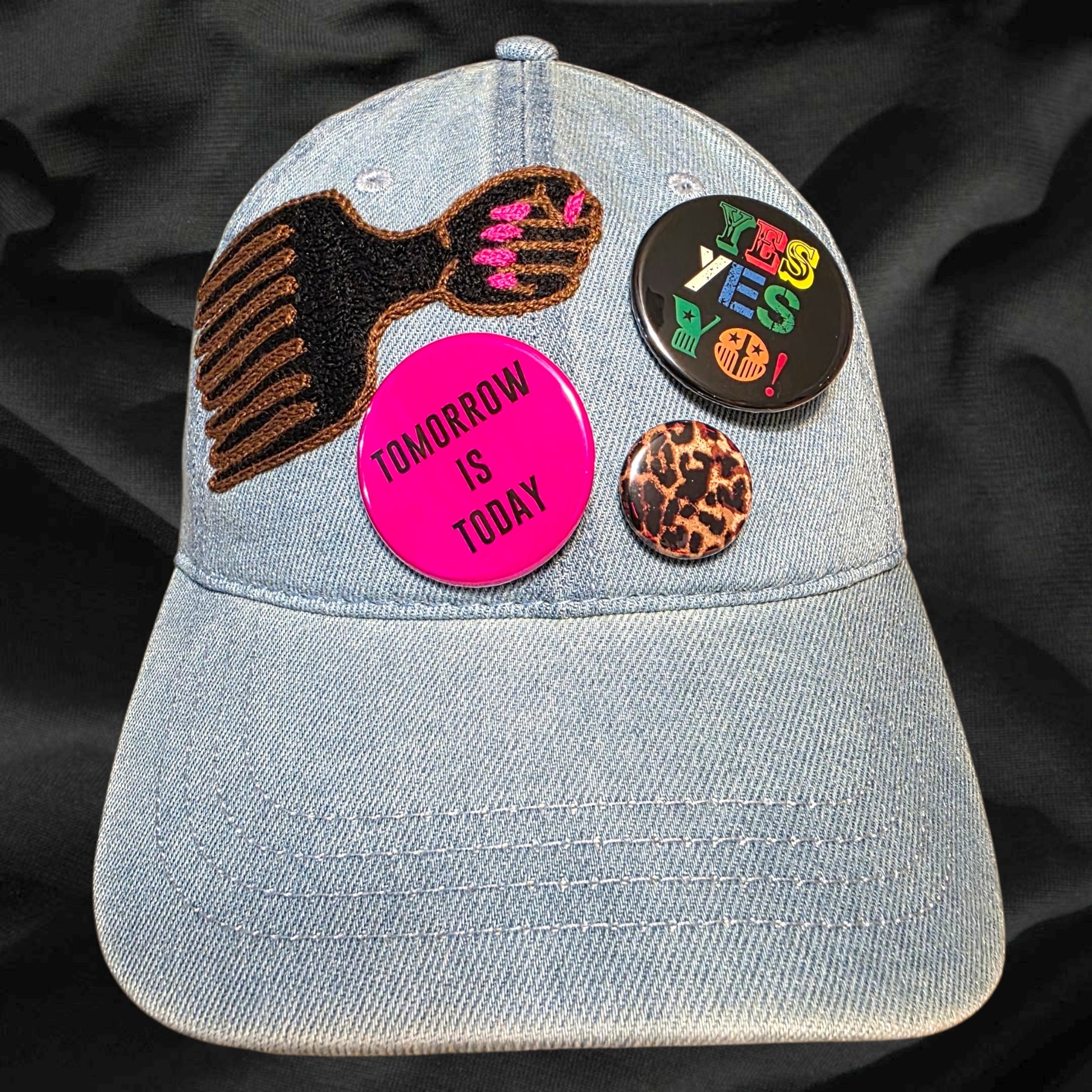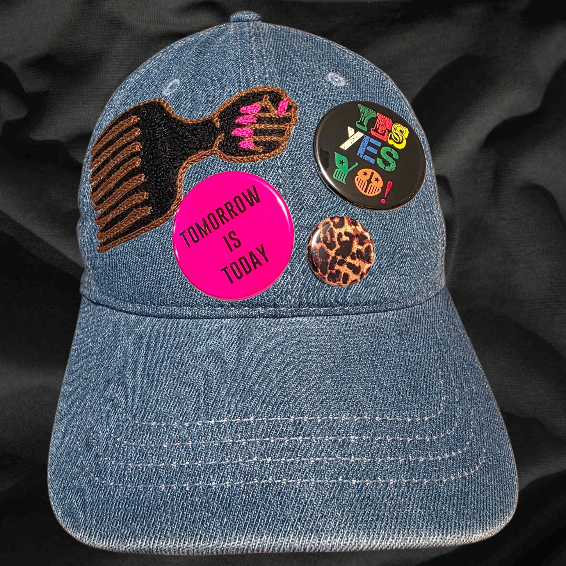 Get into this new cap I made just in time for Black History Month and Women's History Month. This cap features a chainstitch embroidered black power fist hair pick with cute pink nails! It also comes with buttons I thrifted from Fabscrap. A company that helps recycle materials from NYC design houses.